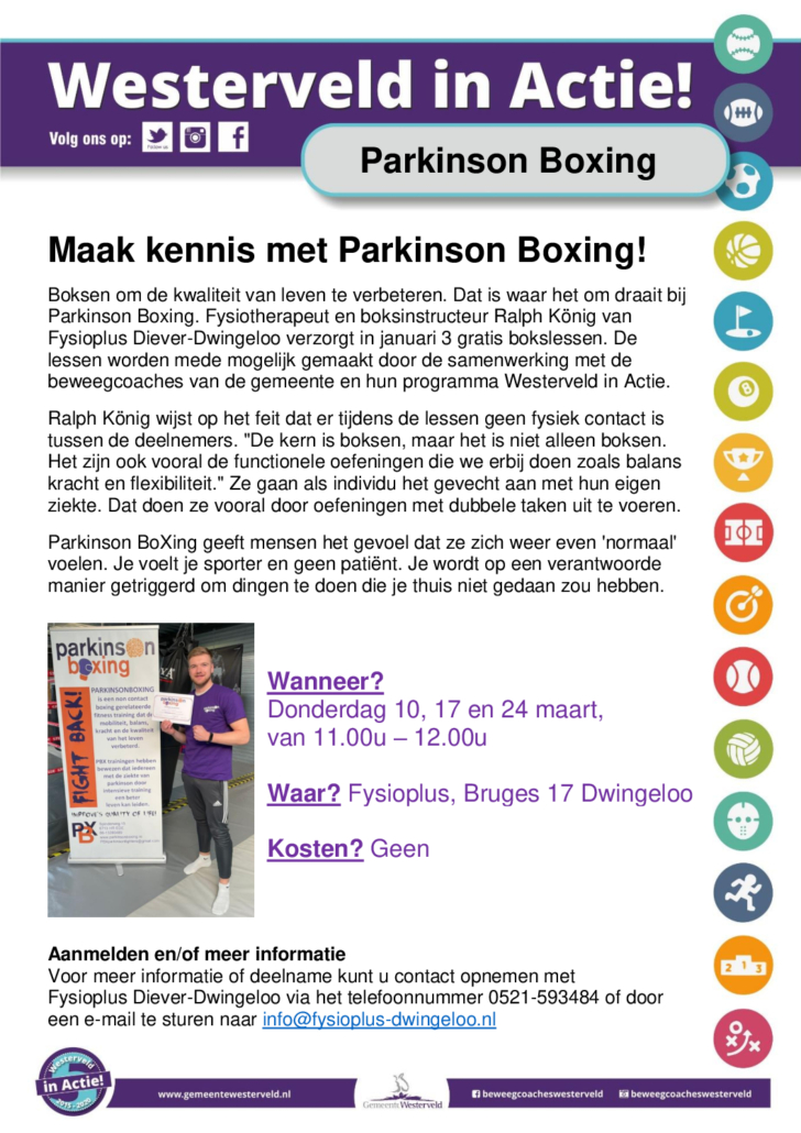 Omdat we in januari niet de mogelijkheid hadden om het Parkinson Boksen aan te bieden in verband met de coronamaatregelen, hebben we deze verschoven naar maart. Omdat we met maximaal 6 deelnemers kunnen trainen is snel aanmelden van belang. Heb je interesse of wil je meer weten over Parkinson BoXing informeer dan via mail naar: [email protected], of bel met ons secretariaat op T: 0521-593484 of loop even binnen.